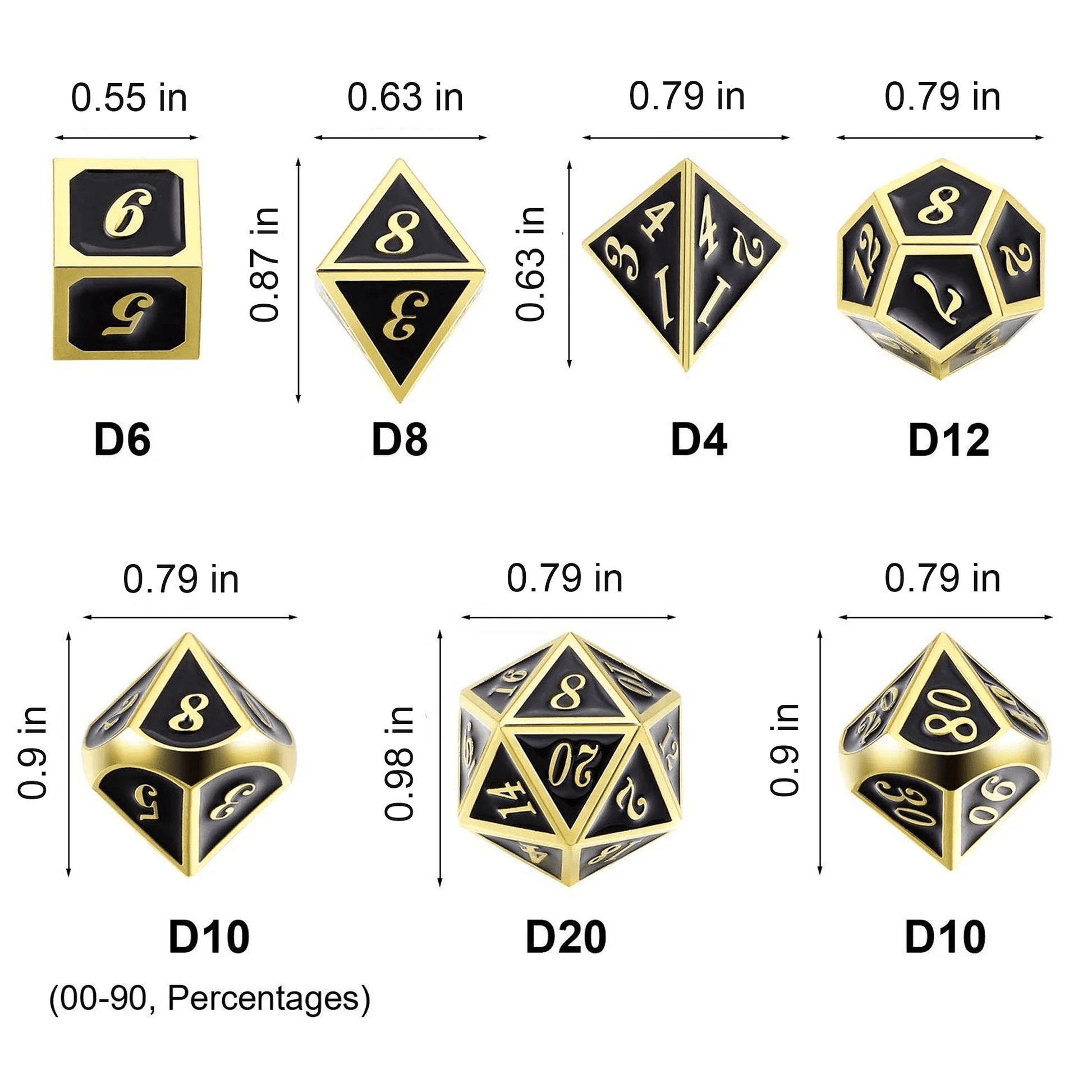 - Metal Dice Set for DND: Our dice set comes with 7 mental polyhedral dice: D4, D6, D8, D10, D12, D20 and D%.