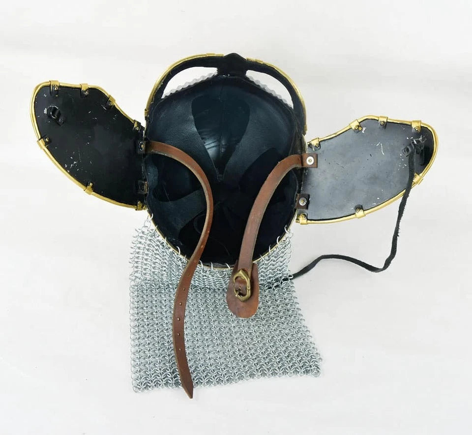 The Viking Wolf Helmet is constructed from 18 gauge steel with brass plate accenting and trim. A butted chainmail aventail is fitted to the back of the helmet and the hinged cheekplates are fitted to the helm with thick and strongly riveted leather hinges. The inside of the face mask is lined with leather for comfort.